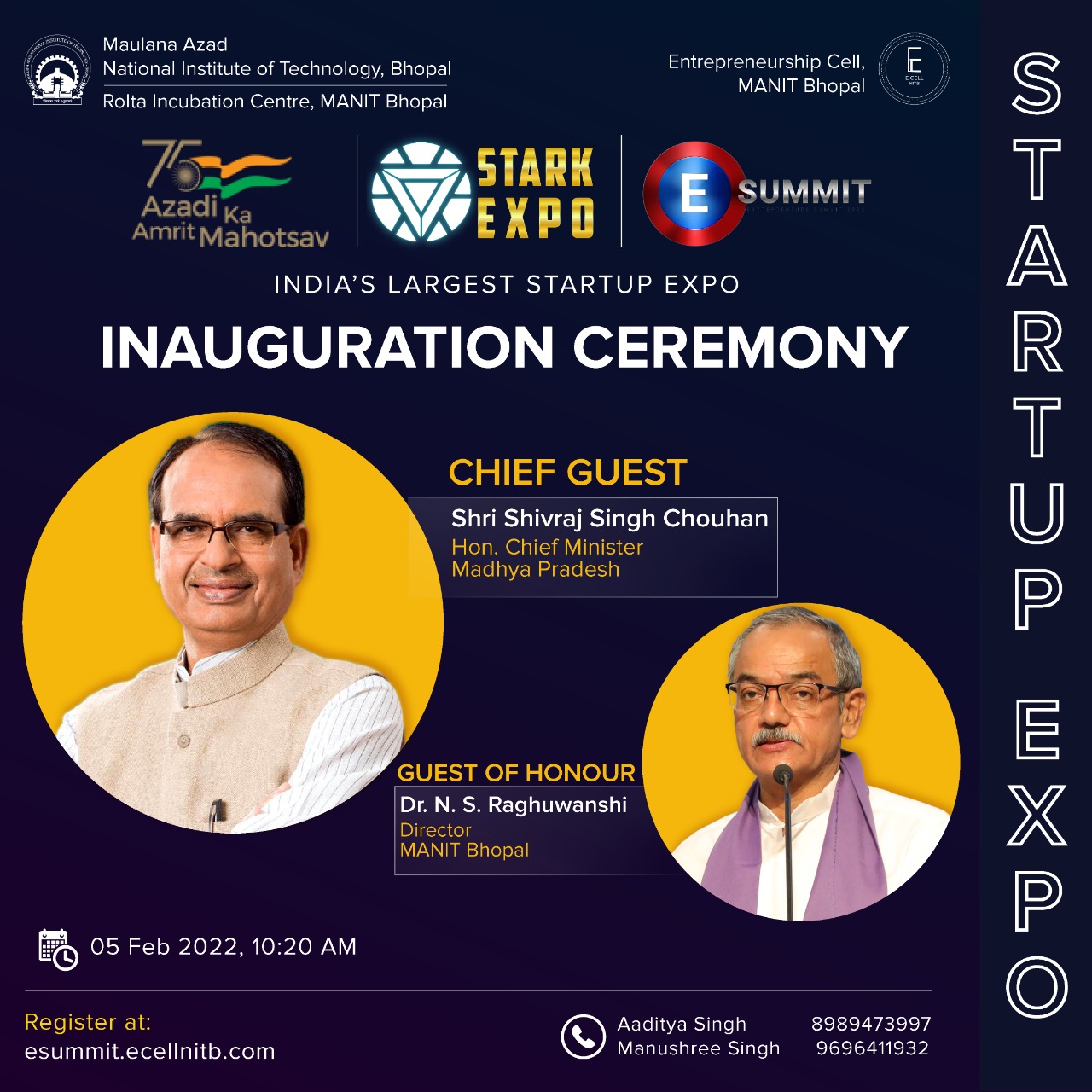India’s Largest Startup Expo organized by E-Cell, Rolta Incubation Centre, MANIT-Bhopal is all set to stage for 5-6 February 2022. The Opening Ceremony of ‘Stark-Expo’ will be graced by the presence of Chief Guest, Honorable Chief Minister of Madhya Pradesh, Mr. Shivraj Singh Chouhan who will inaugurate India’s Largest Startup Expo. The event will also be embraced by the presence of the Guest of Honor, Director of MANIT Bhopal, Dr. Narendra Singh Raghuwanshi.